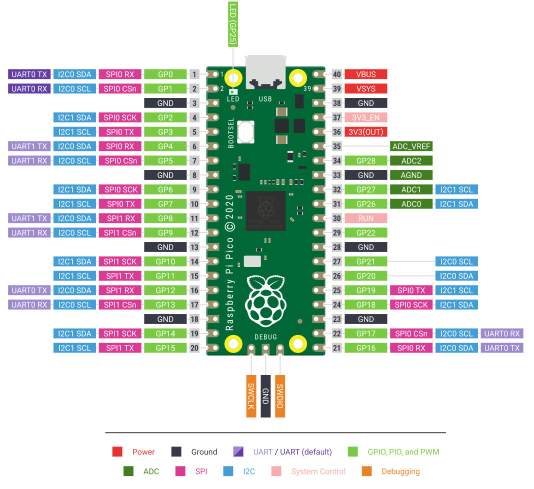 Pinout of the Pico for reference (source: adafruit)